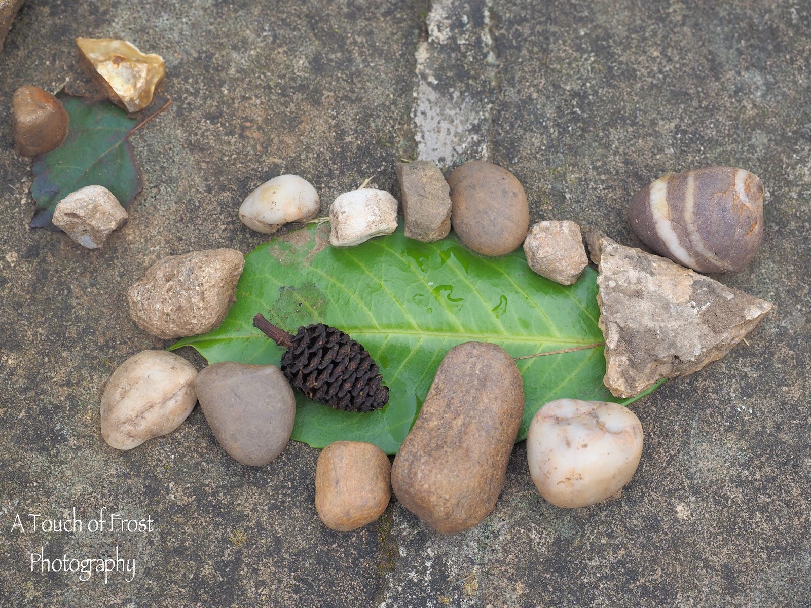 Leaving, I noticed a trail of stones on the wall surrounding the library. On closer inspection, I could see that someone had made, what I take to be a fish out of a leaf from a laurel bush and some stones.